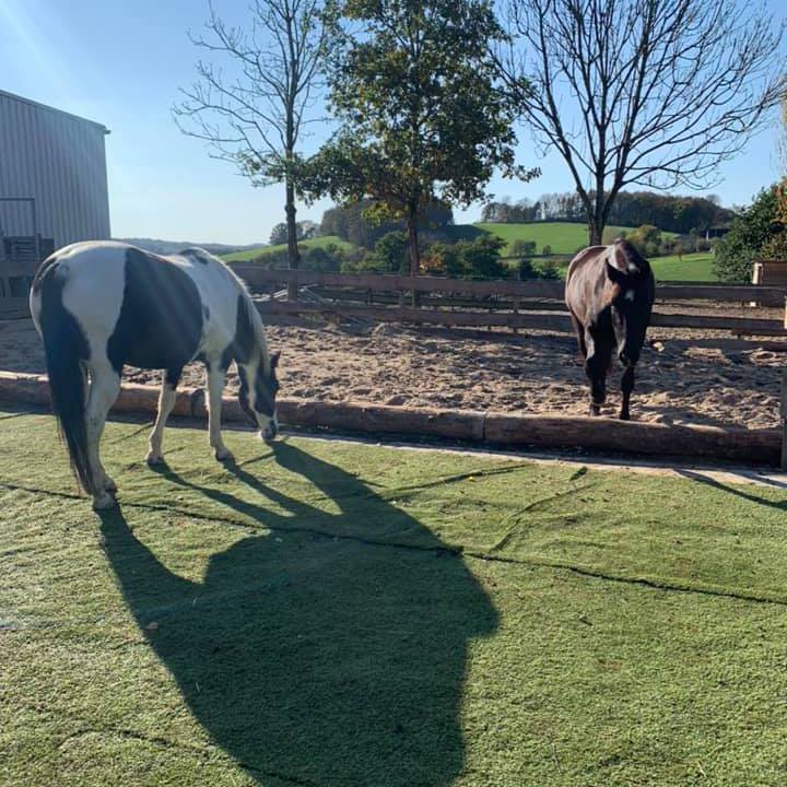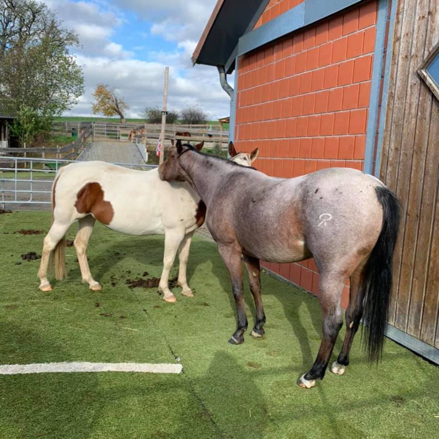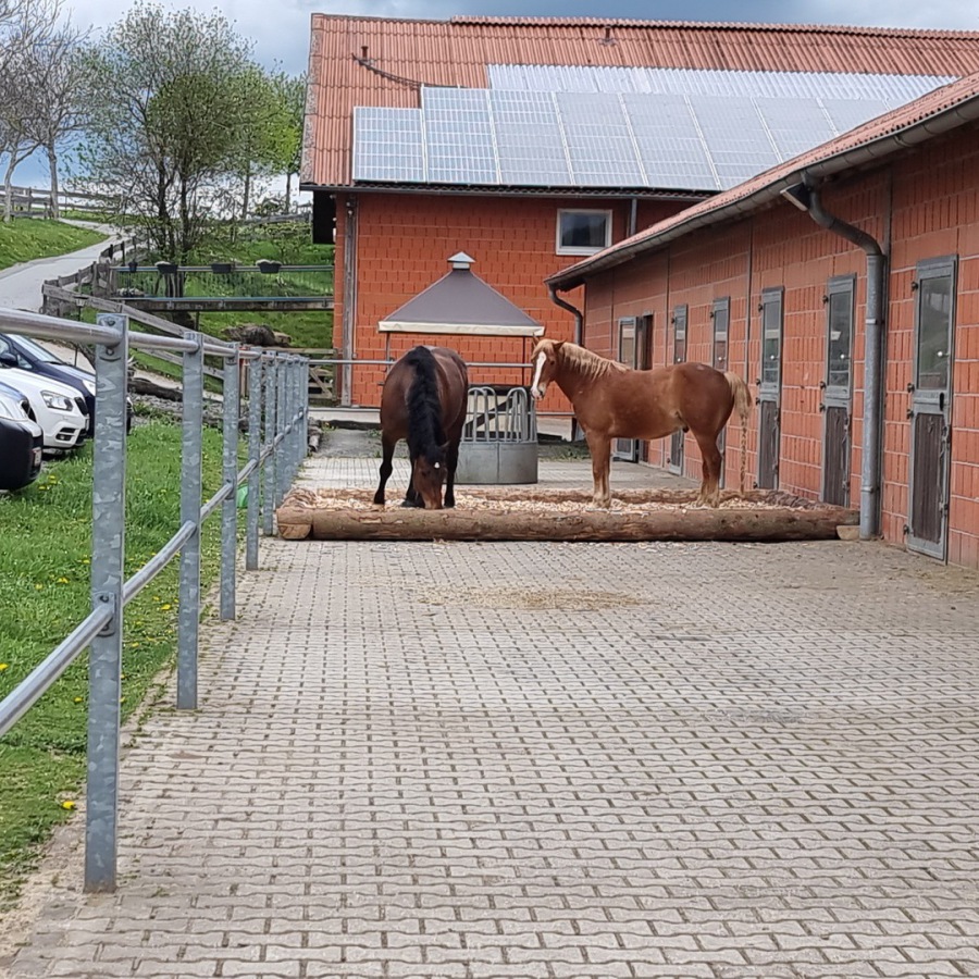 Die Pferde bekommen ausreichend Heu und haben eine große Liegefläche. Außerdem befindet sich im Außenbereich ein großer Sandplatz, in dem sich gerne gewälzt und gesonnt wird. Der Übergang ist mit Kunstrasen belegt, sodass der gesamte Laufstall matschfrei ist.